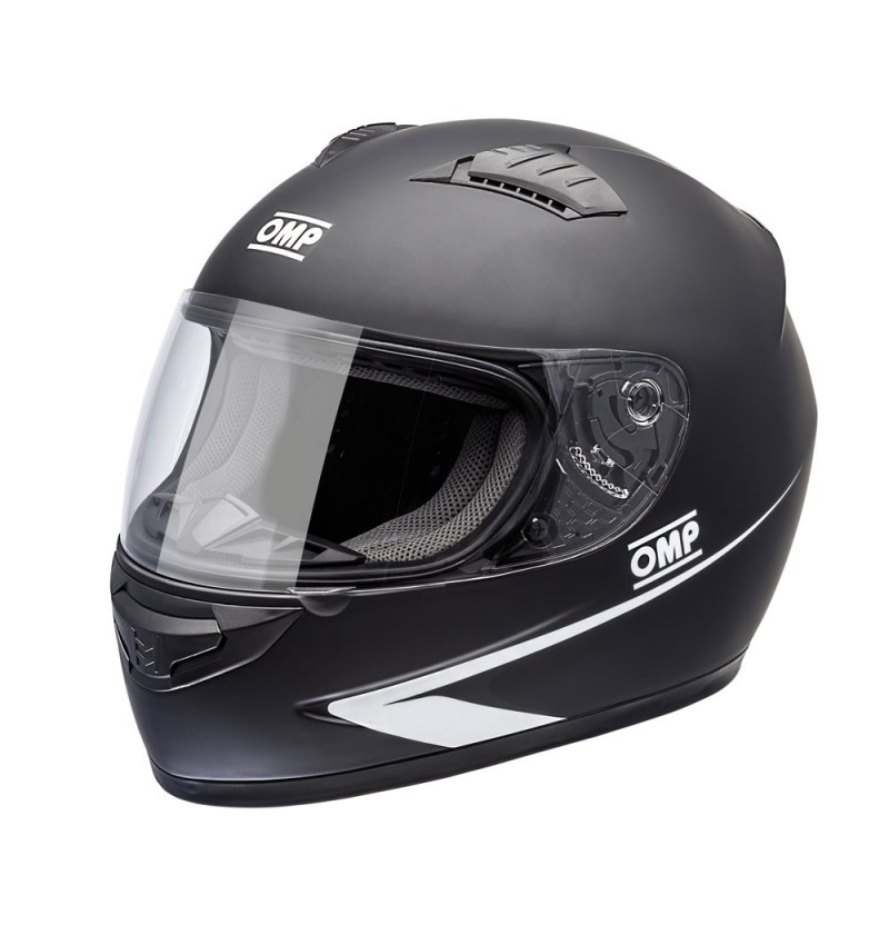 Casque intégral OMP Circuit Evo avec coque thermoplastique, intérieur amovible, ventilation optimisée et visière anti-rayures. Homologué FFSA et ECE 22.06 (route). Noir mat.